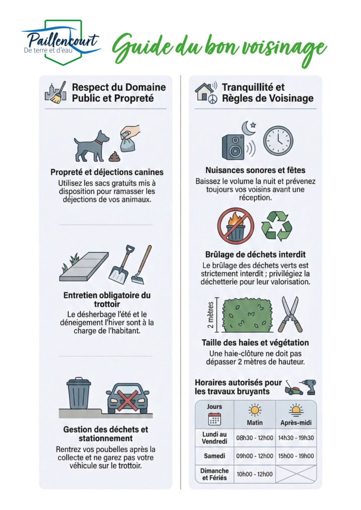 Pour que notre village reste un lieu agréable pour tous, voici un rappel visuel des règles de bon voisinage et des comportements à adopter au quotidien !
