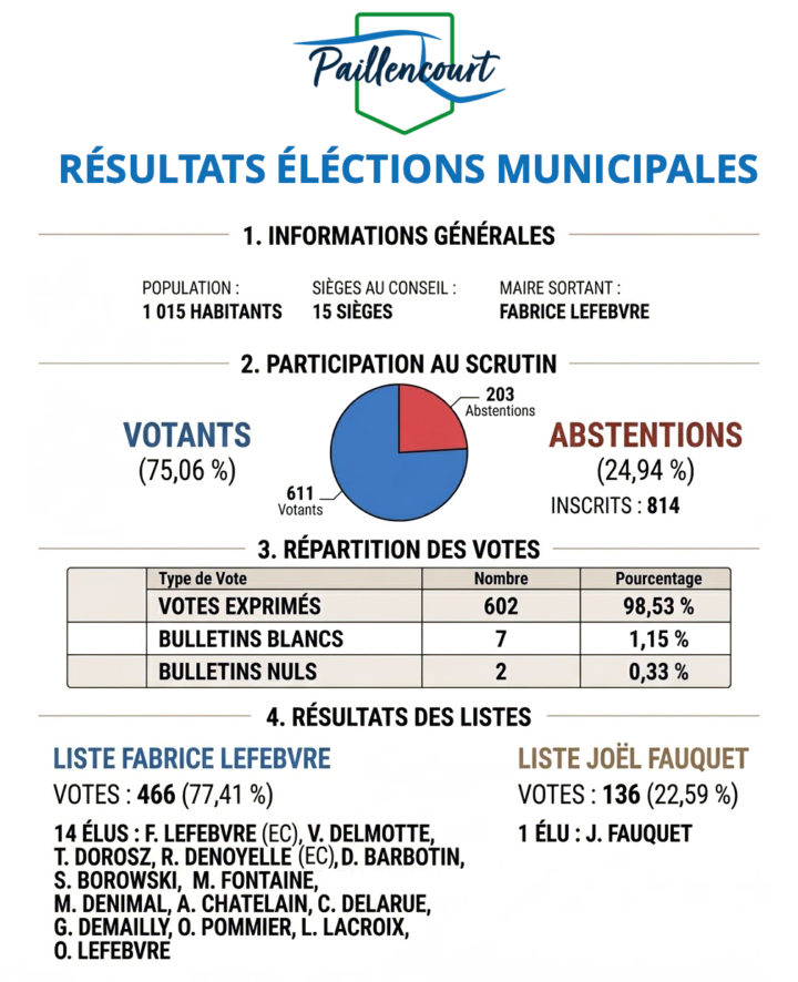 Résultats des élections municipales 2026 par Conseil Municipal · 16 mars 2026 Voici les résultats détaillés des élections municipales à Paillencourt.(EC: élu communautaires à la CAC)